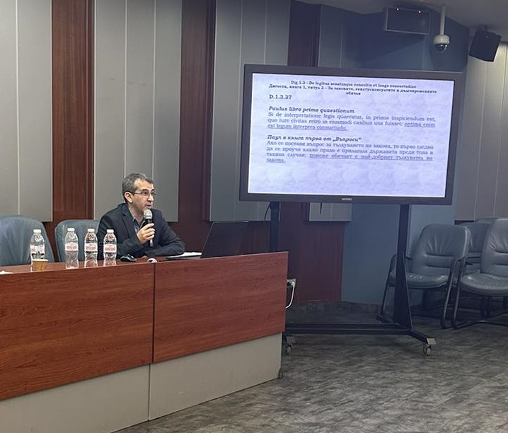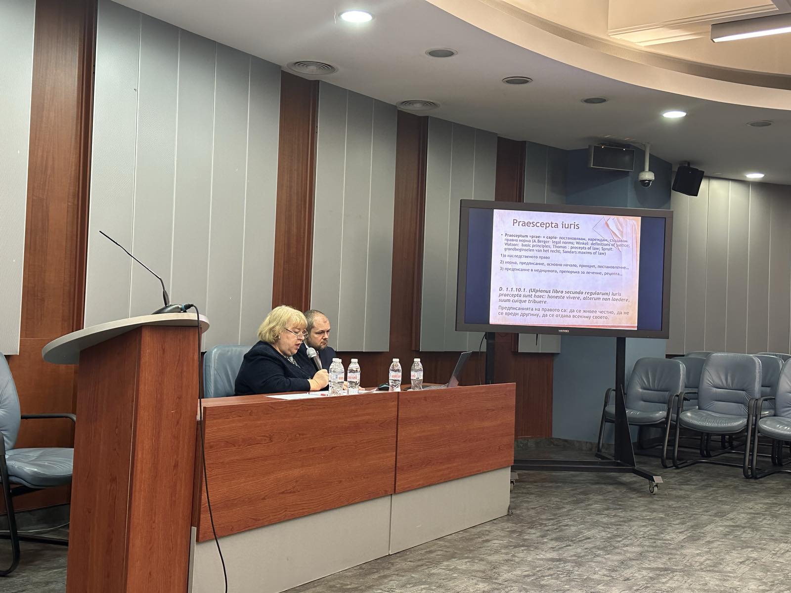 Във връзка с извършваните изследвания върху латинските правни сентенции проф. Малина Новкиришка-Стоянова разгледа темата „Regulae iuris, praecepta iuris и принципи на правото в Древен Рим и тяхното съвременно значение“. Доц. Симеон Гройсман говори на тема „Езикът на правото като формула и правната догматика като начин на мислене“, като представи ролята на изучаването на римското право през Средновековието и Новото време за развитието на правната догматика и свързания с нея начин на мислене.