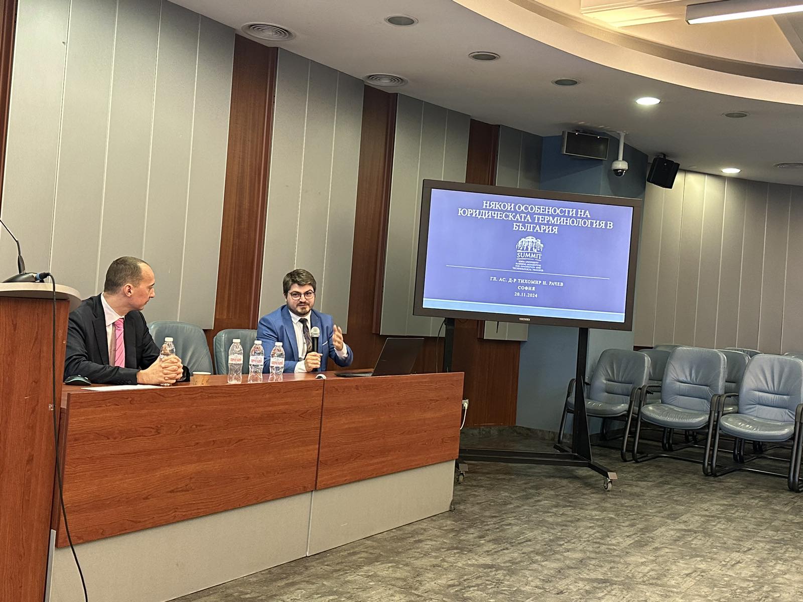 Доклади върху различни аспекти на значимостта на правния език за развитието на бъдещите юристи изнесоха преподавателите в последователните курсове по дисциплината „Юридическа терминология“ в ЮФ на СУ – гл. ас. Стоян Иванов („ Значение на изучаването на латинската юридическа терминология. Термини и понятия относно реалните обезпечения в римското право“) и гл. ас. Дилян Начев („Юридическият език като формиращ фактор за юристите“). Гл. ас. Тихомир Рачев направи преглед на поредица от спорни терминологични въпроси на българския правен изказ, коментирайки отражението им в съзнанието на обучаваните студенти („Особености на юридическата терминология в България“). Конферентната програма завърши с обръщане към изследваната тема от различни исторически и съвременни гледни точки, предложени от гл. ас. Анастас Пунев („Употреби на неяснотата в езика от българския съд“), гл. ас. Димитър Стоянов („Опасностите от систематичното и буквалното тълкуване, или още един поглед върху действието на клаузата за непрехвърлимост на вземане по чл. 99 ЗЗД“) и ас. Методи Тодоров от Пловдивския университет „Паисий Хилендарски“ („Обичаят е най-добрият тълкувател на закона (Dig.1.3.37 – Optima enim est legum interpres consuetudo)“.