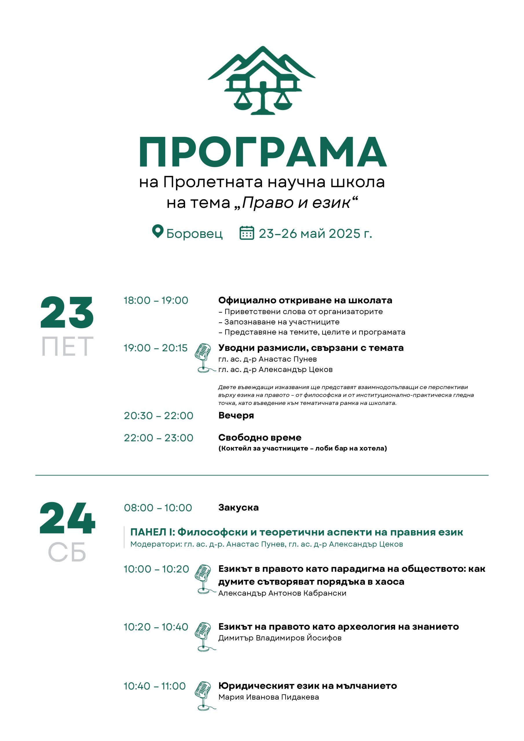 От 23 до 26 май 2025 г. в Боровец се проведе ново, пролетно издание на младежката научна школа на Юридическия факултет, този път на тема „Право и език“.