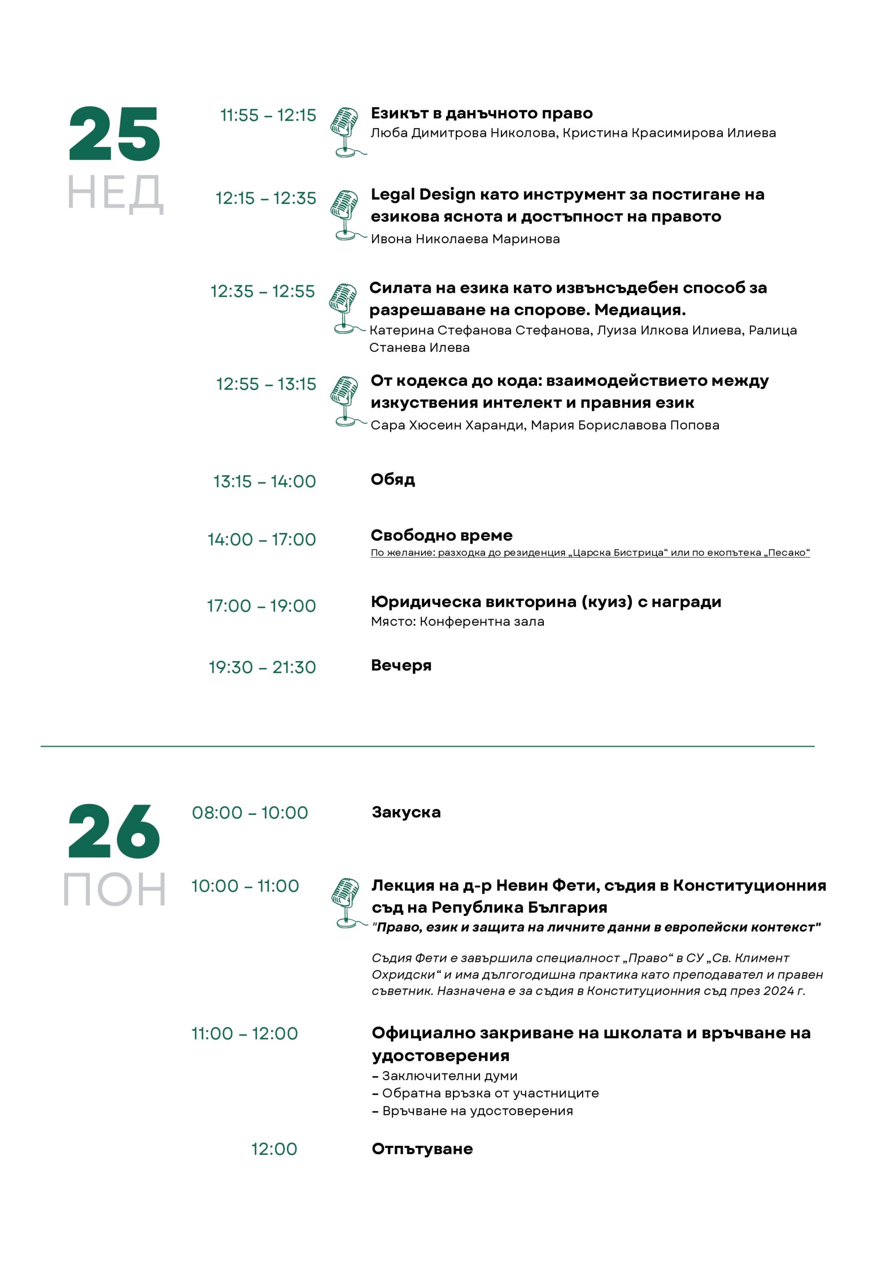 Събитието събра на едно място млади изследователи, преподаватели и студенти, обединени от интереса си към връзката между правото и езика. В рамките на школата бяха представени над 20 доклада, разглеждащи езикови, теоретични, тълкувателни и практически аспекти на правния дискурс. Участниците имаха възможност не само да представят свои авторски разработки, но и да обменят идеи в интензивна академична атмосфера, насърчаваща критичното мислене и научния диалог. Темите на представените доклади и лекции можете да намерите в публикуваната тук програма: