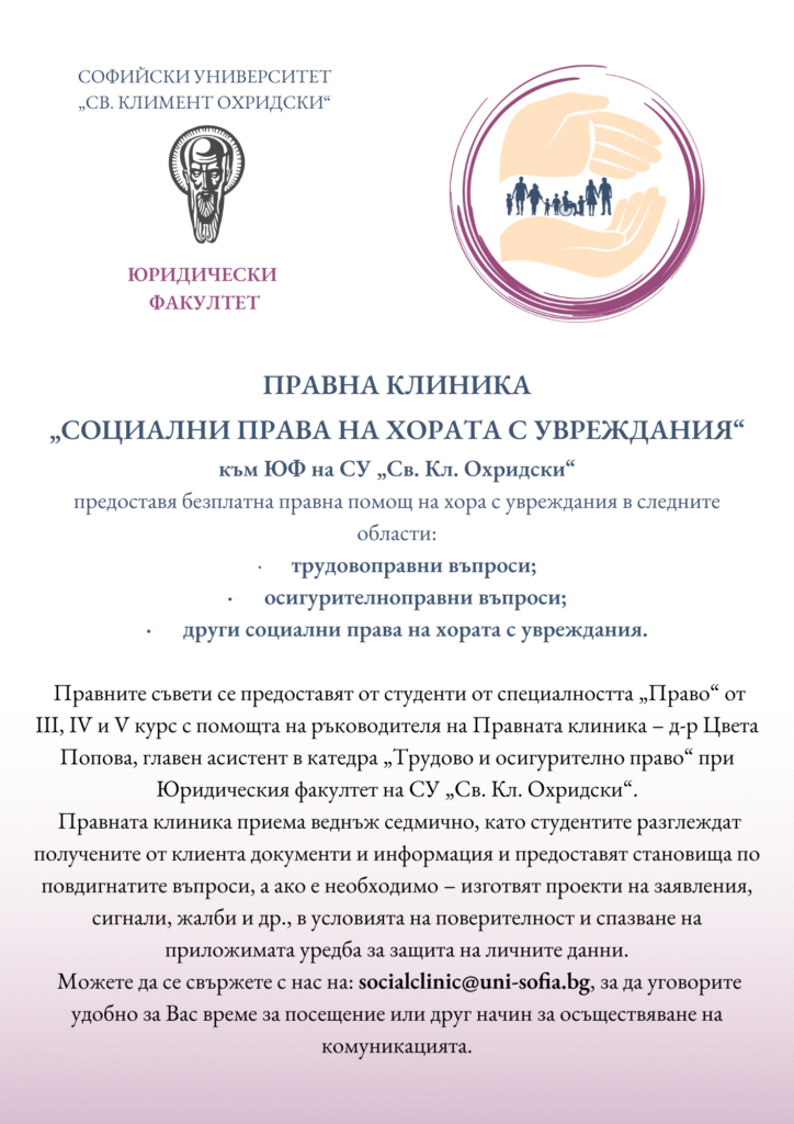 Правна клиника „Социални права на хората с увреждания“ към ЮФ на СУ „Св. Кл. Охридски“ предоставя безплатна правна помощ на хора с увреждания в сферите на: